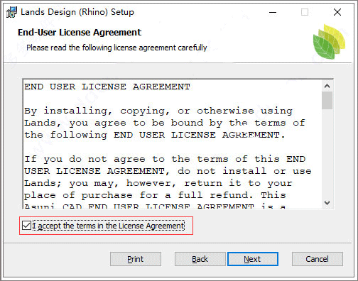 2、首先双击“lands_design_rhino.msi”开始安装,勾选同意条款;