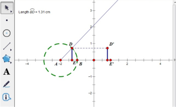 步骤六 顺次选中E、E’点,“变换”→“标记向量”,选中线段DE和点D,“变换”→“平移”,将线段DE平移到E’D’;连结DD’,并把线段改为虚线。