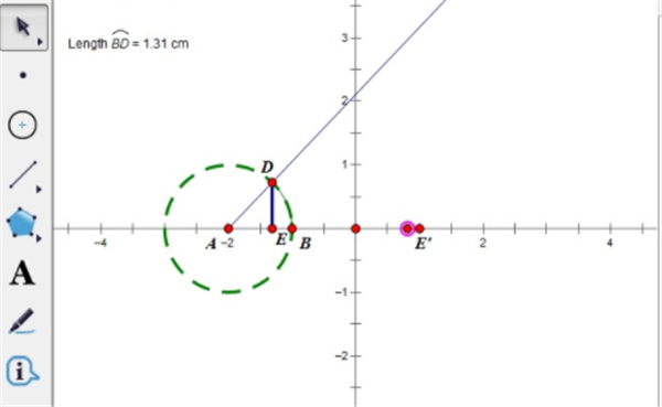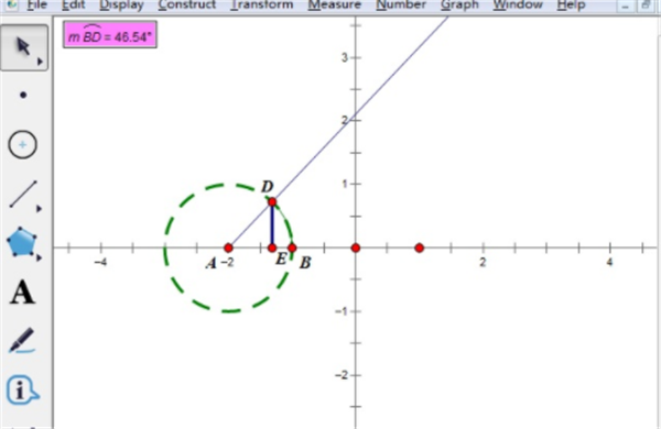 步骤四 顺序选中点B、D和圆,在“构造”里点“圆上的弧”,及时选菜单里“度量”→“弧长”,并及时点菜单里“变换”→“标记距离”。