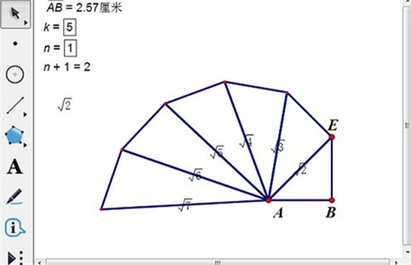 假设有线段AB=1,怎样迭代出表现长度为 根号n公式的线段效果呢?具体的操作步骤如下: