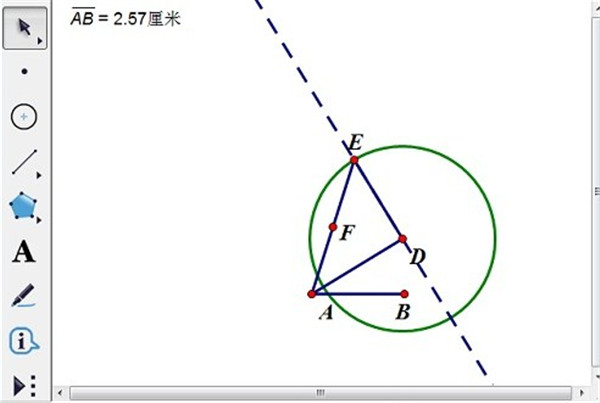 2、在B附近构造点D,构造线段AD。过点D构造线段AD的垂线。选定点D和线段AB的长度度量值,“构造”——“以圆心和半径绘圆”,得到圆与垂线的交点E,构造线段AE和DE。选定线段AE,构造中点F。
