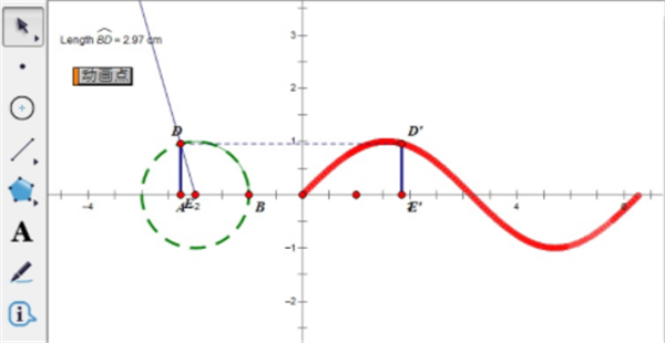 步骤八 选中点D,点“编辑”→“操作类按钮”→“动画”,点击“确定”按钮,然后点击动画点按钮,即可演示正弦函数图像。