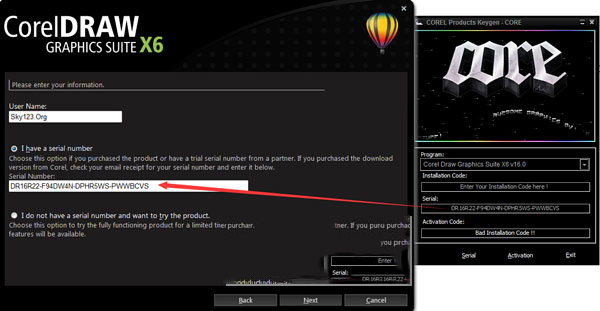 2、打开注册机和安装程序,将注册机选择为“Corel Draw Graphics Suite X6 v16.0”,将下放的“serial”复制到注册框中