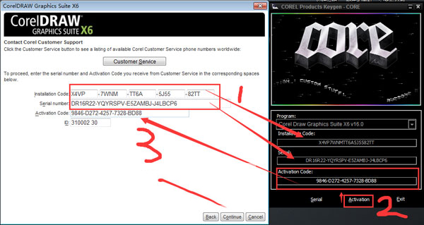 10、将coreldraw x6软件中提示的两串英文输入到注册机相对应的位置,点击注册机的“Activation”生成序列号,复制过去即可