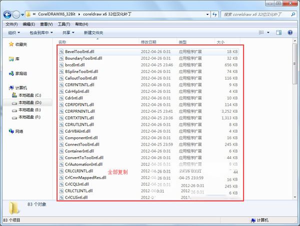 1、将相同版本的coreldraw x6中文汉化补丁打开,复制里面所有的文件