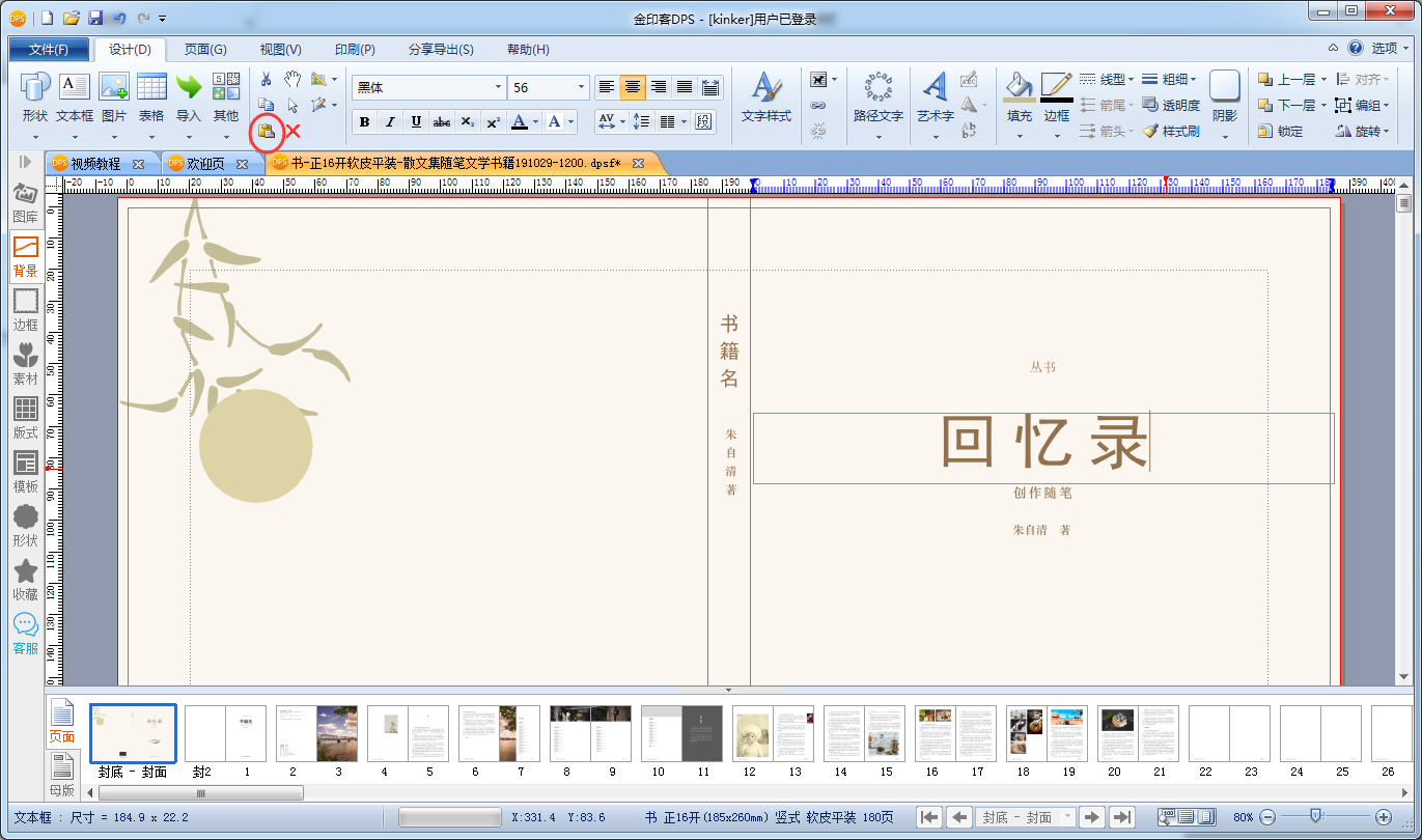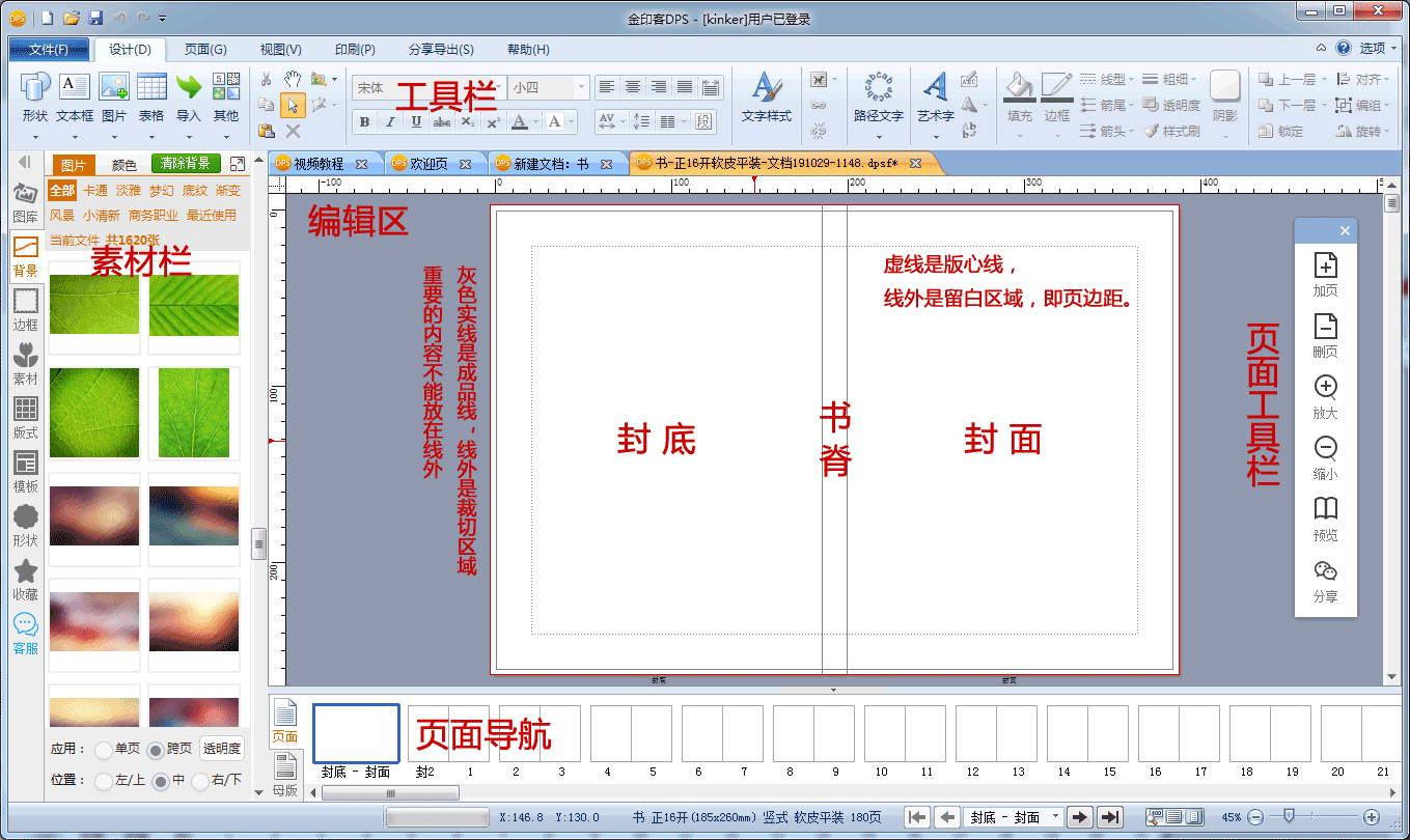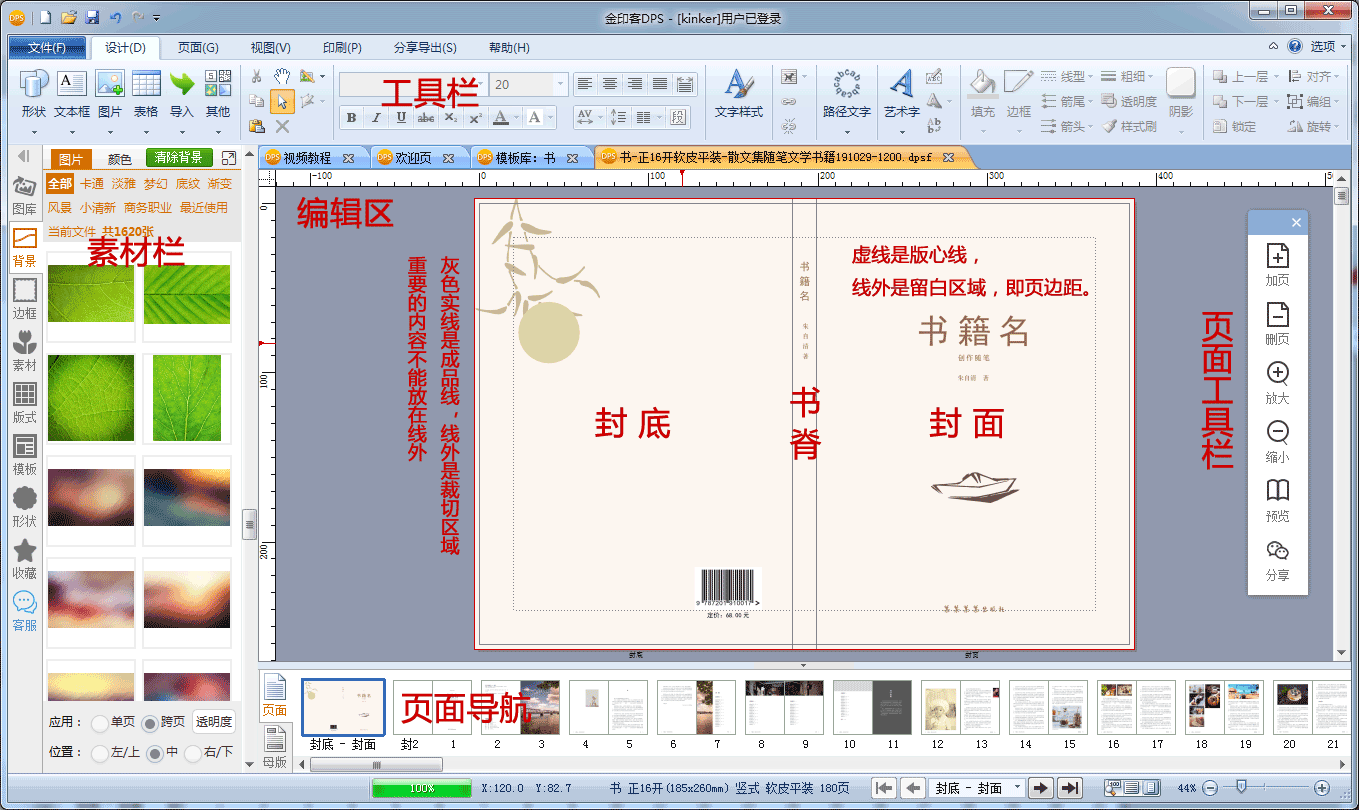 界面中间的页面是编辑区,左边和上边有标尺。第一张是封底-书脊-封面,是一本书翻开扣过来的样子。接下来就是内页。