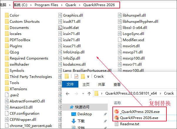 6、接下来将crack文件夹下的2个文件QuarkXPress 2026.exe+_QuarkXPress 2026.exe复制到软件安装目录下替换即可激活;