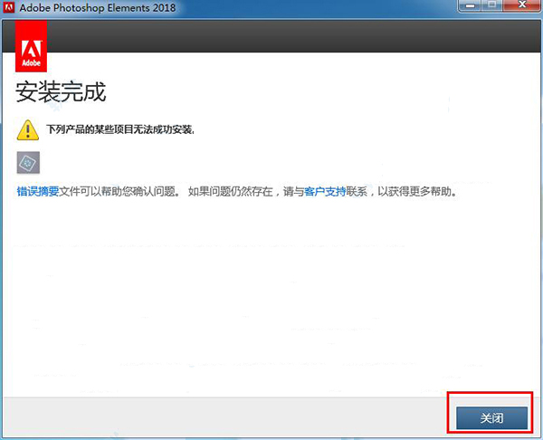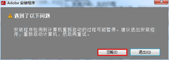 3、运行PhotoshopElements_2018_LS30_win64.exe依提示安装软件,遇到提示说“遇到问题”,请点击“忽略”;