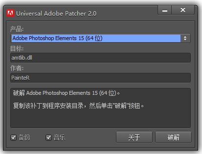 7、接下来,打开激活文件“adobe.snr.patch.v2.0-painter.exe”,选择“Adobe Photoshop Elements 15(64位)”,点击“破解”。