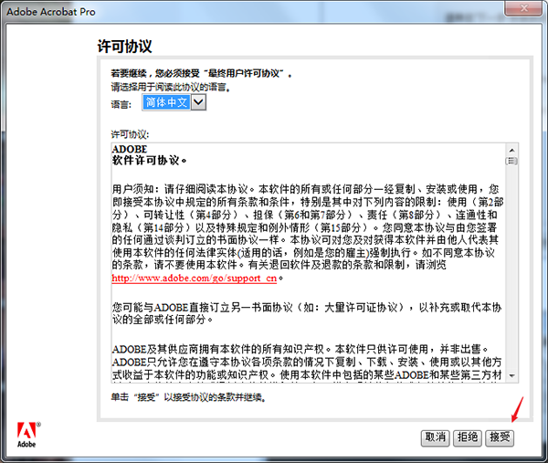 6、返回桌面双击“adobe acrobat 9 pro”快捷当时,默认简体中文,点击接受许可协议;