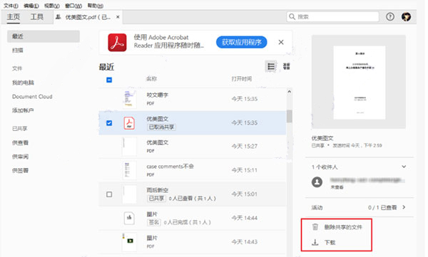 8、上下文窗格和右侧窗格会提供适用于取消共享文件的删除选项和下载/保存副本选项