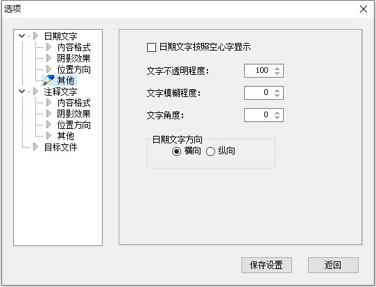 日期文字和注释文字都有对内容格式和影像的设置效果,其他还包括位置方向、文字透明度、模糊程度以及文字角度等等,其中日期文字方向可设置为横向或者纵向。