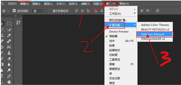 3、安装完后重启PS可在PS窗口-扩展功能调出安装的面板