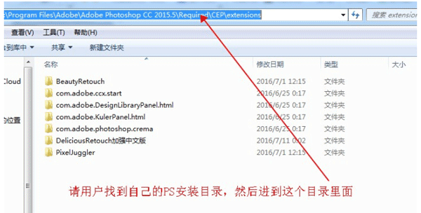 2、然后打开购买下载得到的扩展面板,找到:“DeliciousRetouch加强中文版”文件夹,然后复制这个文件夹,粘贴到刚才打开的PS面板目录:D:\Program Files\Adobe\Adobe Photoshop CC 2015.5\Required\CEP\extensions(PS安装在哪个盘就打开相应的盘符,我这里是装在D盘,所以打开的是D盘,如果你的在C盘,那就是C盘)