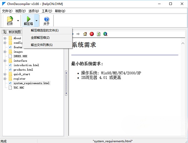 1、轻松反编译CHM格式的帮助文件或电子书2、完美恢复CHM的.HHP工程文件