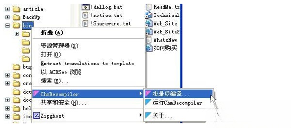 4、想要解压缩一个目录下的全部CHM文件,在资源管理器或桌面里用鼠标右键点击一个目录, 然后在右键弹出菜单里选择 "批量解压缩...",在批量操作对话框里按"开始"按钮, 然后 ChmDecompiler就会自动在指定目录下搜索并解压缩全部.CHM文件,如下图所示: