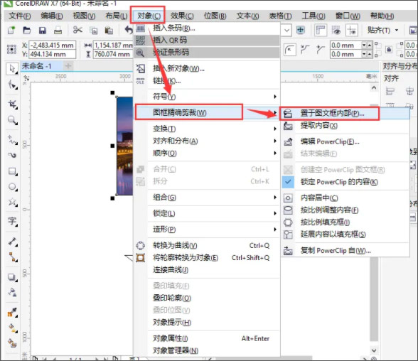 5、点击菜单栏上方的【对象】——【图框精确裁剪】——【置于图文框内部】。