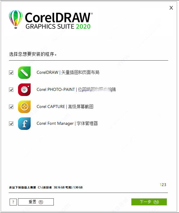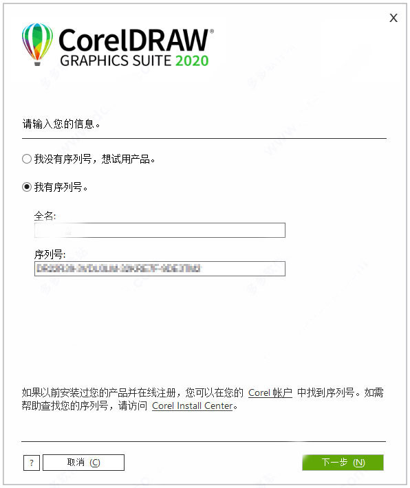 2、使用用户自行购买的序列号,默认安装包括coreldraw2020、Corel PHOTO-PAINT 2020 、Corel Font Manager 2020和Corel CAPTURE 2020;