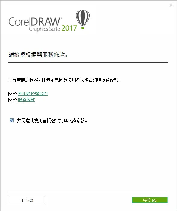 2、文件提取成功后,进入CorelDRAW安装向导,弹出软件许可协议对话框,勾选我同意,单击“接受”按钮继续。