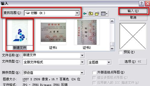 3、在输入文件对话框中,选择文件所在的盘,选择要输入的文件,点击输入按钮,即可输入文件