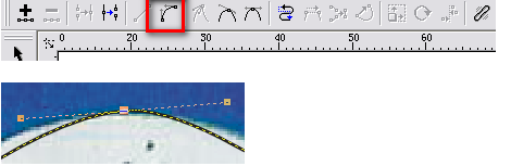 6、然后点击造形工具属性栏中的“转换直线为曲线”按钮,此时在新建节点上出现两个控制手柄,拖动控制并便可改变弧度