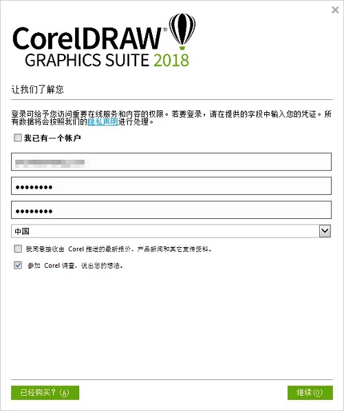 3、下载完毕后,界面会提示注册产品账户相关信息,要登录,需要创建一个Corel,账户输入邮箱及密码。如果您已经购买此产品,点击“已经购买”,进入下一步。