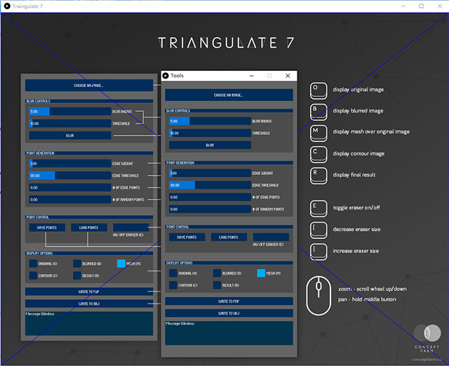 image triangulator是目前小编用过的最好的晶格化软件,使用该软件可以将图片快速进行多边形化,像素色块化,以及图片晶格化。用户通过对图片模糊控制,加载绘制点,控制网孔等操作,再结合一些渲染技术和灯光效果,可以让你的图片看上去像纸工艺或折纸作品,效果非常的赞。不过需要注意的是:目前官方并没有image triangulator汉化版,只有英文版,但因为软件的设计思路较为清晰。且提供的功能较为简单所以不懂英语的也可以使用,有需要的朋友快来下载体验吧!!!