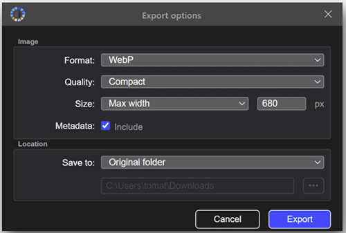 要将照片转换为 JPEG、PNG、WebP 或减小照片尺寸,请使用Tonfotos 中的导出模式。存档中的原始文件将转换为不同格式或大小的精确副本。在这种情况下,照片本身将保持不变。