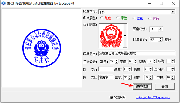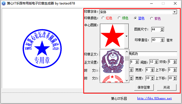 箫心it乐园专用版电子印章生成器自带多种中心图案,可对图案尺寸、印章直径进行更改。还可以手动编辑印章正文、正文设置等等,功能非常全面,有兴趣的小伙伴可以下载尝试一下!