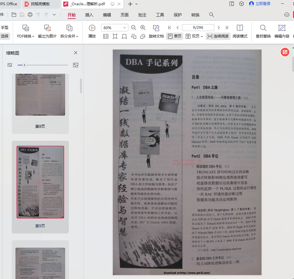 Part1 DBA 之路 0 人生就是如此—冯春培感悟之路 Part2 DBA 手记 1 杨廷琨的DBA 手记 2 姜龙的DBA 工作手记 3 面向程序员的数据库访问性能优化法则 数据库访问优化法则简介 Oracle 数据库的两个基本概念 数据库访问优化法则详解 4 Linux 大内存页Oracle 数据库优化 案例的引入 操作系统中的CPU 使用分析 使用大内存页来解决问题 小结 Part3 SQL 与SQL 优化 5 SQL 执行计划解读与案例分析 得到SQL 的真实执行计划 执行计划的执行顺序 10g/11g 里执行计划的一些增强 绑定变量对执行计划的影响 10053 事件分析执行计划一例 看似正常的执行计划导致严重性能问 题的案例 监听连接时间过长案例外一则 6 使用SQL Profile 改变和稳定SQL 执行计划 SQL Profile 与Outline SQL Profile 是什么 手工创建SQL Profile 使用SQL Profile 稳定SQL 语句的执行 计划 使用SQL Profile 更改SQL 语句的执行 计划 一个使用SQL Profile 的案例 7 Oracle 中的NULL 值解析 NULL 的基础概念和由来 NULL 的布尔运算的特点 NULL 的默认数据类型 空字符串‘’与NULL 的关系 NULL 和索引 NULL 的其他方面特点 Part4 内部原理与优化 8 B*Tree 索引中的数据块分裂 如何分裂 树的生长 存储参数 分裂事务控制 数据块分配 等待事件 附:10g 中如何构建“高”索引