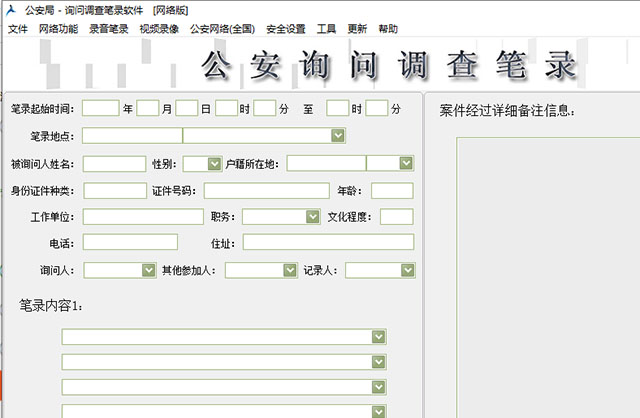 公安询问笔录软件是一款绿色小巧,功能实用的公安笔录软件,该软件提供了网络功能、法律法规、监察文书、语音笔录、安全设置、更新、工具等栏目,具有文字笔录录制、音频笔录录制、视频取证笔录录制的3大创新功能,能够帮助公安局办案人员进行日常询问笔录的制作、修改、打印、上传,是提高公安办公效率的好帮手。公安询问笔录软件还拥有模板功能,可以编辑笔录软件的颜色、网址、标题、人名、地址、户籍、问题、答案等等所有信息,自由组合,自由设置,可以满足所有笔录人员的使用习惯,真正实现公安笔录的全自动化制作,欢迎免费下载收藏。