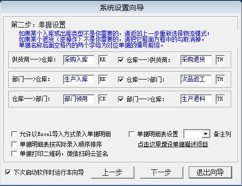 2、之后对需要的单据进行设置,如果某个入库或出库类型不是您需要的,请返回上一步重新选择模式;如果某个退货(逆操作)不是需要的,请把它前面方框中的勾取消掉。