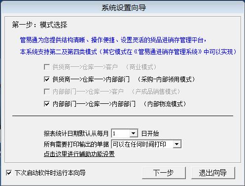 1、使用软件前,先需要设置系统模式,软件提供了采购-内部领用和内部物流两种模式供用户选择。