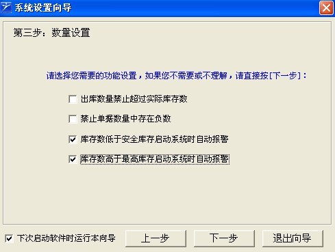 4、接下来对数量进行设置,包括对出库数量禁止超过实际库存数、禁止单据数量中存在负数、库存数低于安全库存启动系统时自动报警、库存数高于最高库存启动系统时自动报警、在入库出库单据中显示库存数量以备参考等。