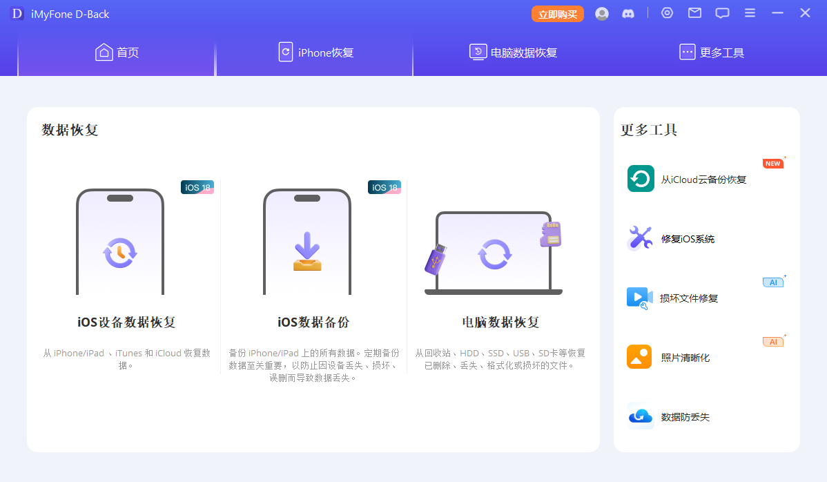 imyfone d-back官方版是一款功能强大的数据恢复工具,用户只需一键即可帮助用户快速恢复删除和丢失的数据,其可恢复达200多种数据,这样无论用户是哪种情况丢失的数据都可帮忙恢复,非常的方便。