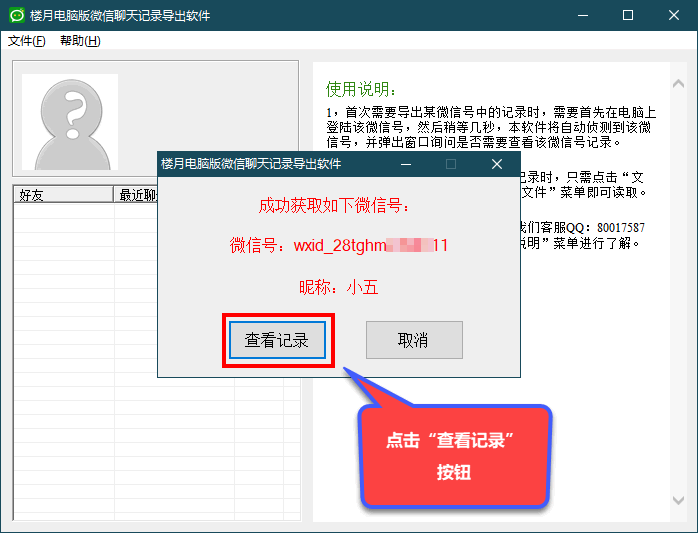 2、打开“楼月电脑版微信聊天记录导出软件”,稍等几秒后,软件将自动侦测到当前登陆的微信号,点击“查看记录”按钮。