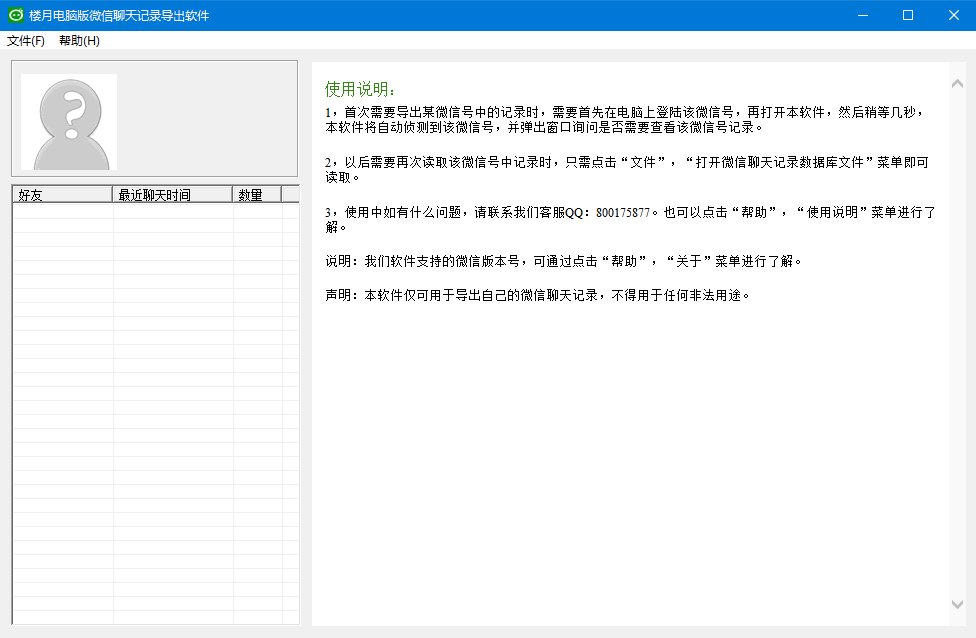 楼月电脑版微信聊天记录导出软件是一款协助导出及恢复微信聊天记录的工具,使用该软件能够将pc端的微信聊天记录导出,支持导出所有文字聊天,语音聊天,接收或发送的图片及小视频等,同时软件还可恢复自己不小心删除的微信聊天记录。