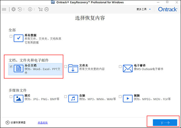 打开软件我们会发现,可以恢复的内容已经做好了分类,比如今天我们想要恢复的是Excel,那么如下图所示,在这个步骤我们就选择文档、文件夹和电子邮件-办公文档,然后点击右下角的“下一个”进入下一个步骤;