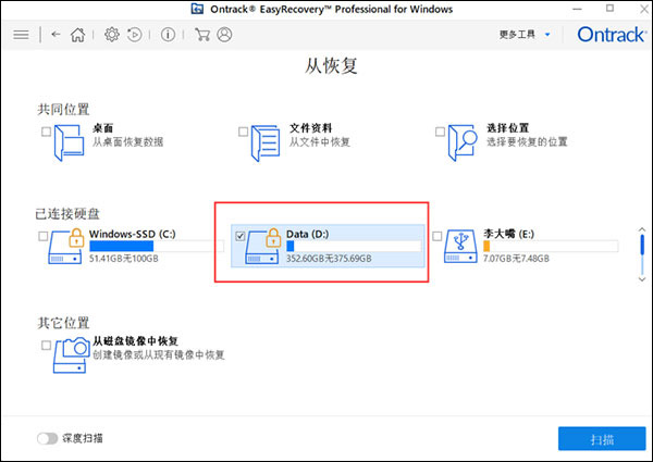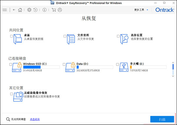 提供的恢复位置主要有共同位置、已连接硬盘、其他位置,如下图所示: