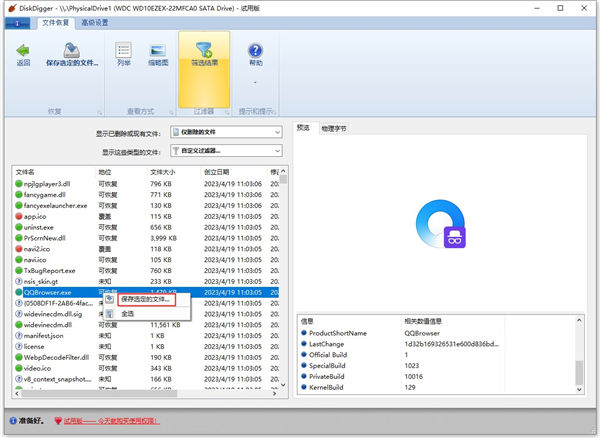 6、之后,点击其中的文件,它会在右边为你预览恢复文件,然后点击选中文件鼠标左键,选择保存选定的文件;
