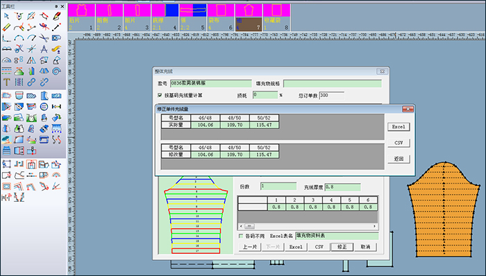 6、充绒功能:软件自动计算纸样充绒,并且提高了准确性,能够保存Excel和CSV文件。