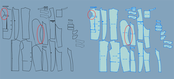 2、联动:强大的联动修改功能可以完成关联部位的同步修改,无须担心对应部位的尺寸偏差,包括结构线间联动,结构线与纸样联动调整,转省、合并调整,对称等等工具的联动,调整一个部位,其它相关部位都一起修改,剪口、扣眼、钻孔、省、褶等元素也可联动。