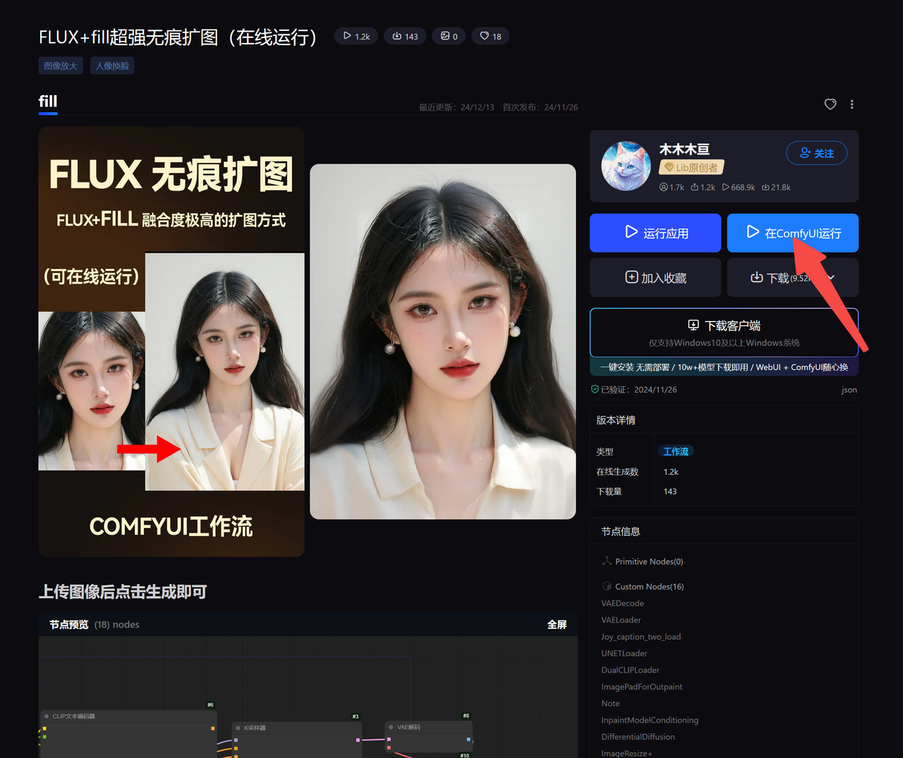 我们以“FLUX+fill超强无痕扩图(在线运行)-工作流-木木木亘-LiblibAI”为例,讲解一下使用方法