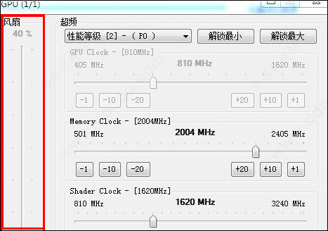 4、左边的是风扇转速,如果你想要超频,那么一定是要手动调整固定风扇转速的,一般根据你超的量来决定到多少,最低70%以上,最高可以到100%,如下图所示: