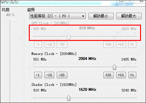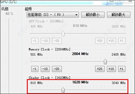 2、关于超频设置,软件工具允许您选择性能级别,然后修改其高级选项。因此,可以使用指定的滑块配置GPU,内存和着色器时钟。