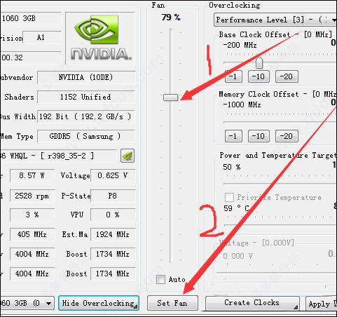 4、取消“√”后,你就可以把鼠标点击到1箭头所指的按钮,通过上下移动就可以把显卡速度调整到你想要的转速了,把按钮拖动至你所设定的地方后,再点击一下2箭头标识的Set Fan按钮确认设置速度就可以了,如下图所示: