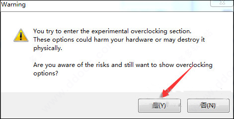 2、接着将会弹出一个警告框,将会提示你将要进入超频选项,因为有些显卡不支持超频,所以这里会有个提示,可以忽略它,这里默认选择 “是” 按钮,如下图所示: