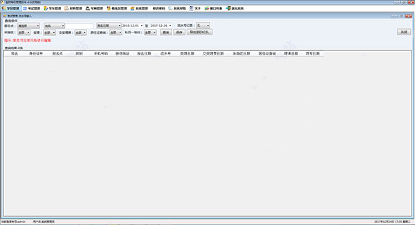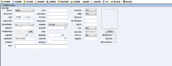 4、完成上述基础设置后,在学员管理-新生报名中登记学员信息和交费信息。学员未交齐学费可以在财务管理-学费收款中登记补交的学费。交费记录可以在财务管理-学费收款查询中查看。