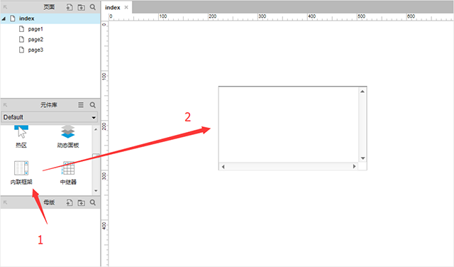 1、新建一个项目,在元件库里,拖动一个内联框架元件到 index 页面。