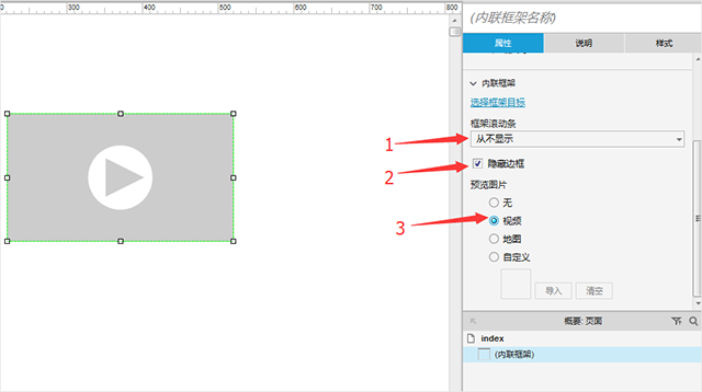 2、在页面的右侧,选择 框架滚动条:从不显示;勾选隐藏边框;预览图片选择:视频; 然后保存。